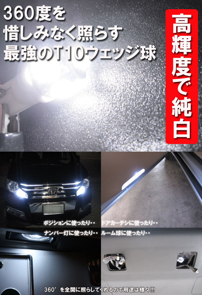 使用箇所はポジション球、サイドウインカー、ナンバー灯、ドアカーテシ、バック球、ルーム球など、 T10/T16が使用されている箇所でポン付けできます。
