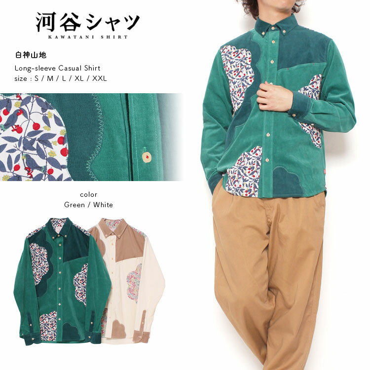 河谷シャツ 白神山地 カジュアル 長袖シャツ / k2031108 / 全2色 ホワイト グリーン 全5サイズ S M L XL XXL シャツ 長袖 メンズ レディース 男女兼用 / 刺繍 パッチワーク コーデュロイ カジュアルシャツ ボタンダウンシャツ ドレスシャツ おしゃれ